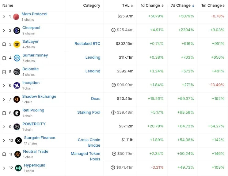 Protocols also showed varied movements, with notable weekly TVL growth among Stargate, Hyperliquid, and Dolomite, all rising by at least 20%.