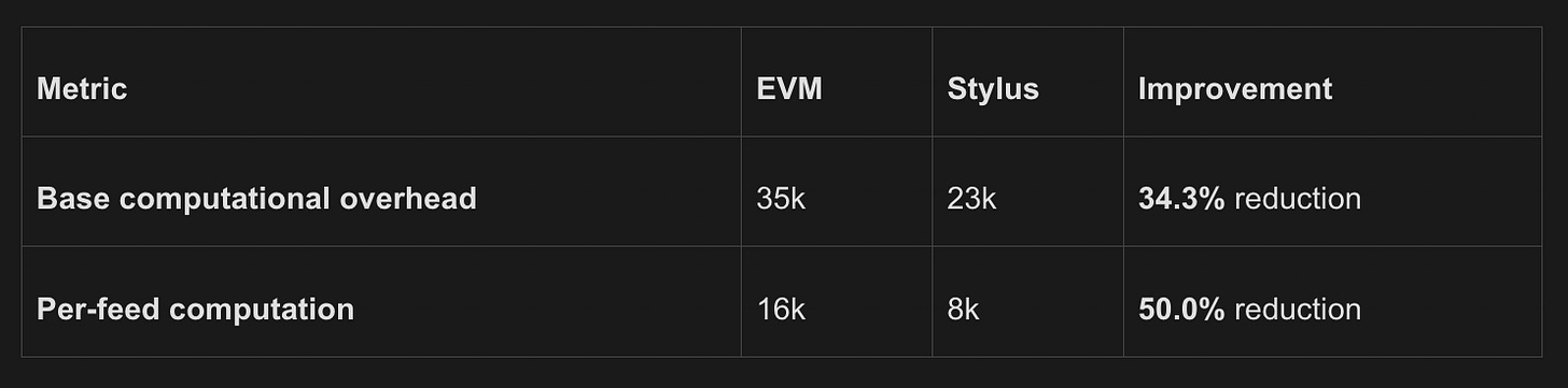 These advantages translate into tangible savings and improvements, both in the base computational overload (34.3% reduction) and in the computation per-feed (50% reduction), as highlighted in the table below. Compared to its EVM implementation, Stylus still achieves 26% total savings by cutting computational costs nearly in half.