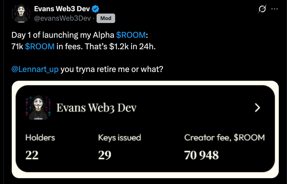 On the one hand, creators are able to monetise their insights into rooms, where each room is private and gated by keys.