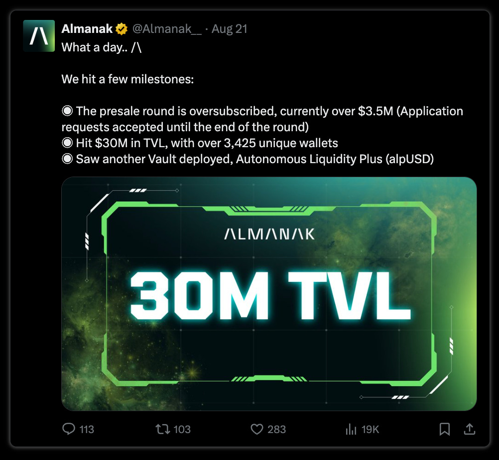 The protocol has already accumulated over $30m in TVL in its Autonomous Liquidity Vaults.