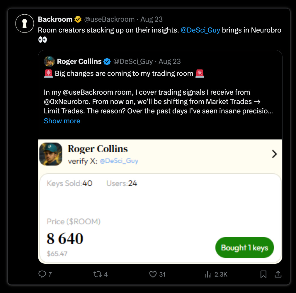 In about a week, they generated over 230k in fees, with some big names such as @beast_ico joining the platform and already sharing gud alfa in their rooms: