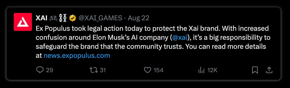 In other legal news @XAI_games is suing Elon’s xAI for confusion around the two names: