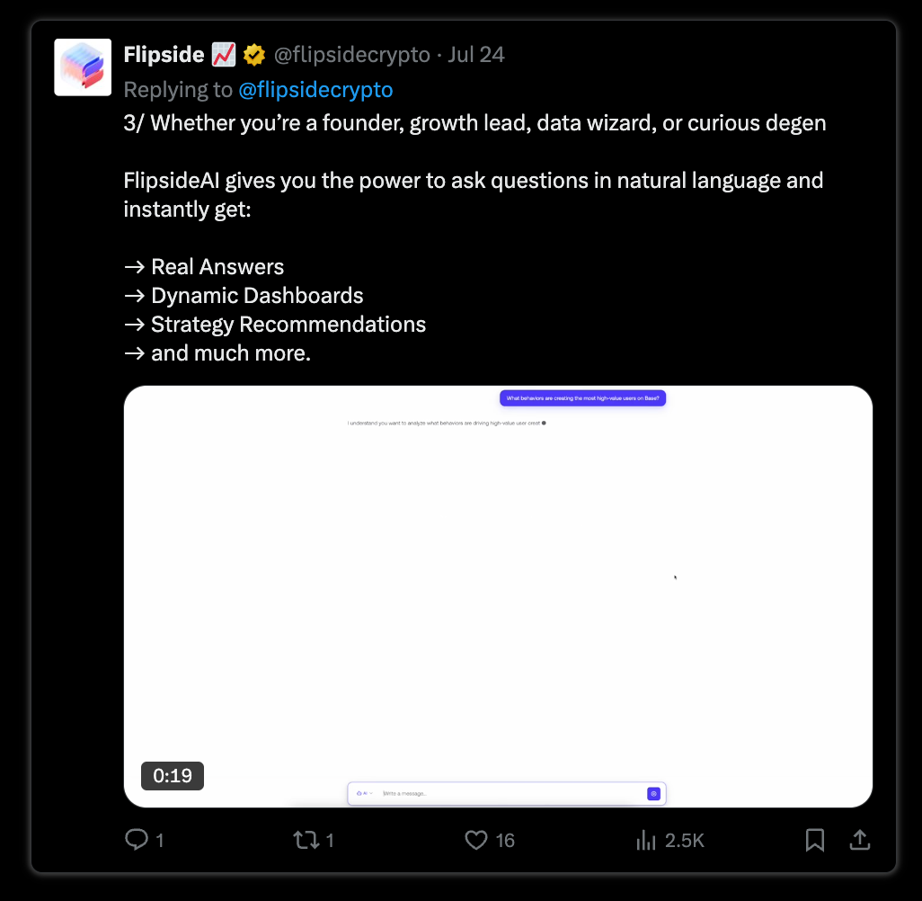 Recognising the rapid advancement of AI in the last year, Flipside launched FlipsideAI in July 2025, which is now accessible through the FlipsideAI chat or leading LLMs like Claude, Gemini, Cursor, and more through the Flipside MCP (Model Context Protocol) Server.