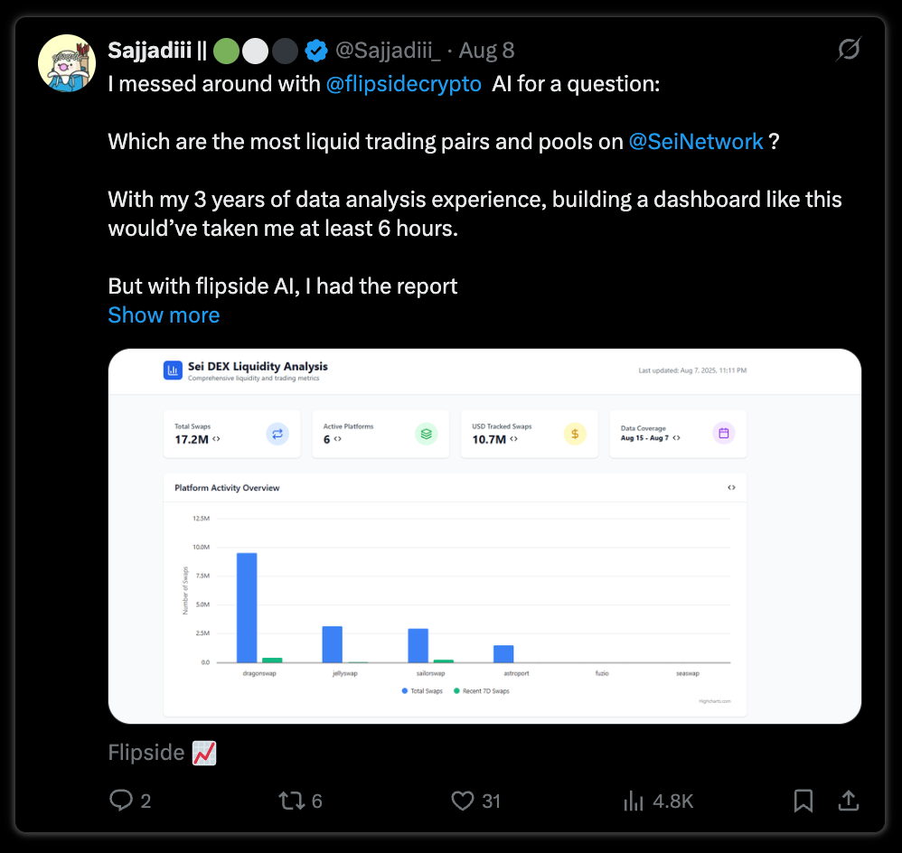 At the centre of this is FlipsideAI, an AI */* Intelligence Platform where anyone can tap into comprehensive blockchain intelligence through natural language prompts. This AI-native platform processes data from 35+ blockchain networks, including Bitcoin, Ethereum, Solana, Base, and more, and hundreds of protocols to deliver instant insights through dynamic dashboards, reports, and more.