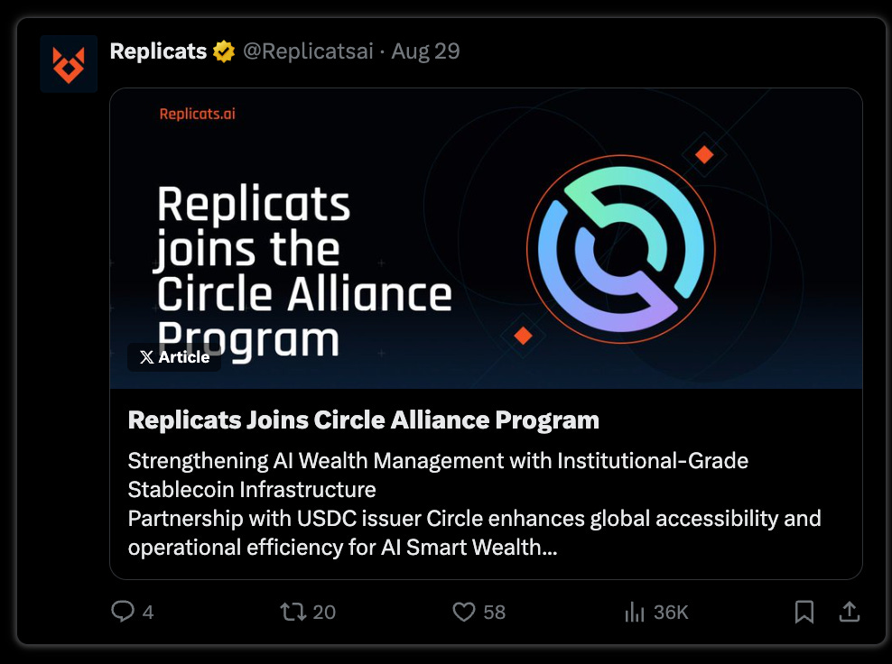 Also wouldn't be an AI dispatch without some @virtuals_io update. Among those, this week @Replicatsai announced that it has joined the Circle Alliance Program, highlighting the need for proper (institutional-grade, depending on the use case) infrastructure for AI.