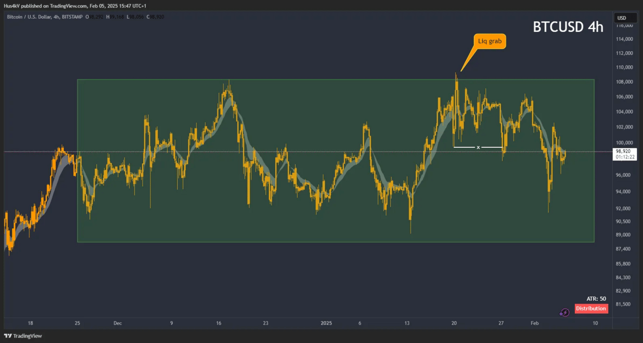 Last week we also zoomed in a little into this sideways price action and identified some first signs of loss of momentum. My bullish expectation was that price will liquidate some lows and continue its run to new ATHs. Unfortunately, we’re not quite seeing that and price continues seeking liquidity lower.