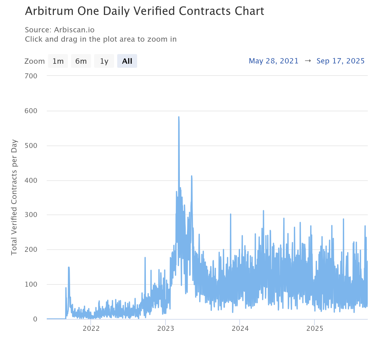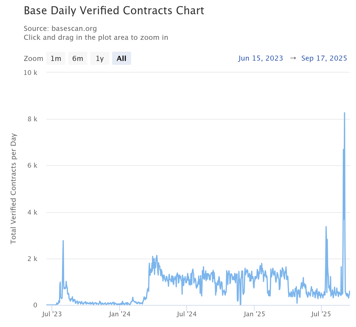 In line with this data, Base deploys verified contracts about three times more than Arbitrum or Optimism. However, we need to consider several key variables here. For instance, this is partly due to external campaigns, such as Coinbase’s Onchain Summer. Some spikes are artificial, as projects like Clanker deploy thousands of contracts simultaneously, and there is increasing activity from AI agents. Still, the trend is more solid than that of competitors. Arbitrum’s verified contract count has been steadily declining since 2024, however, while Base is deploying many new token experiments (now comprising nearly 50% of the total), Arbitrum remains anchored in DeFi protocols, indicating a clear difference in developers’ focus on these chains.