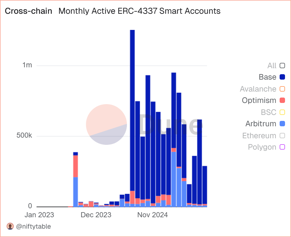 To conclude, we examined the number of smart accounts present on these chains, which generally indicates a better user experience. Base, again, is leading. They have the most monthly active smart accounts, the highest number of successful UserOps (proxy for transactions), and are earning the most fees. These numbers could be explained by Coinbase’s Base Account, which significantly simplifies the developer experience of integrating wallets into dApps. Solana, being non-EVM, plays in a different sandbox altogether.