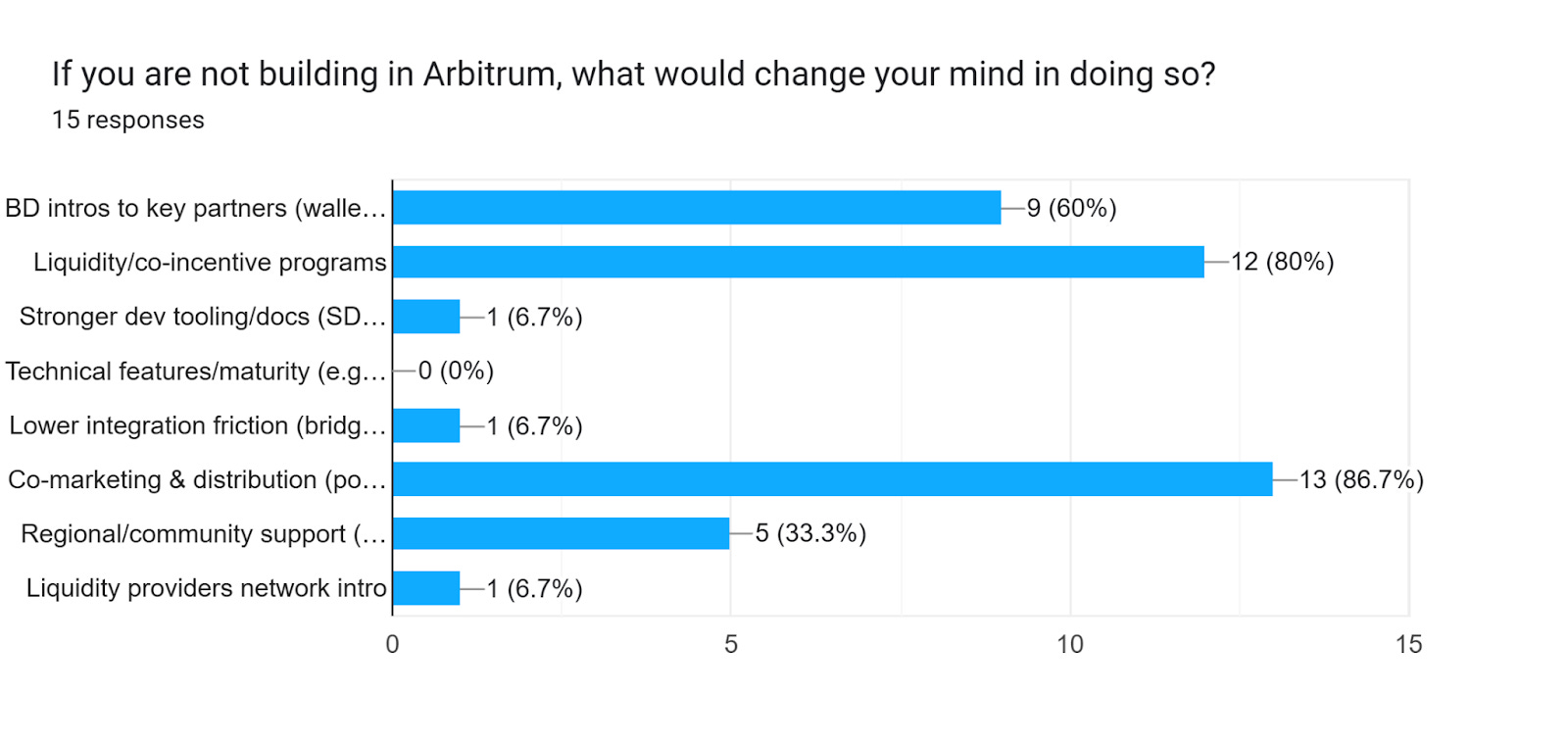 4. Awareness and fit gaps remain. A non-trivial slice hadn’t heard of the grant program we run with the Arbitrum DAO, or perceived Arbitrum primarily as a DeFi chain, or found the category fit unclear for their project.