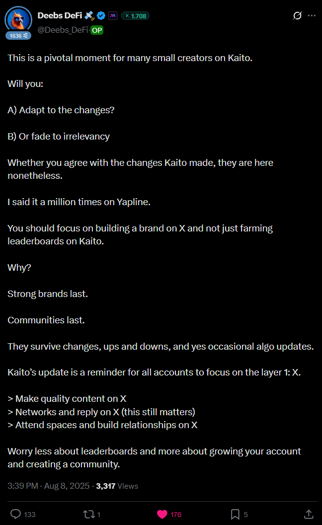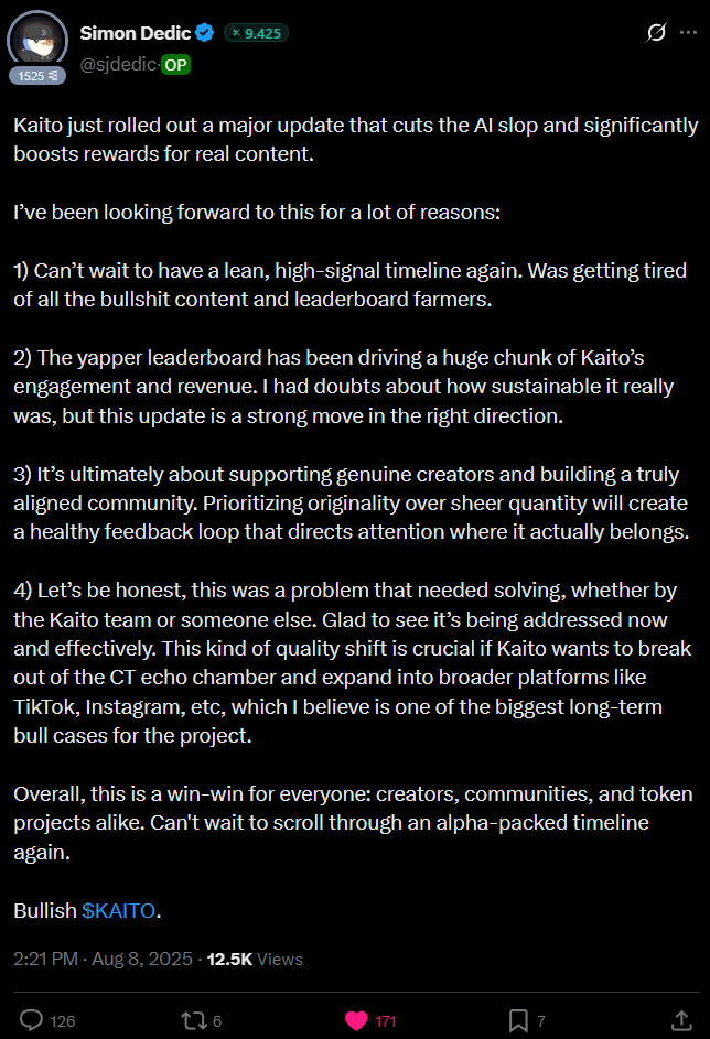 Other major creators view this upgrade as good news, so the Kaito team is definitely heading in the right direction.
