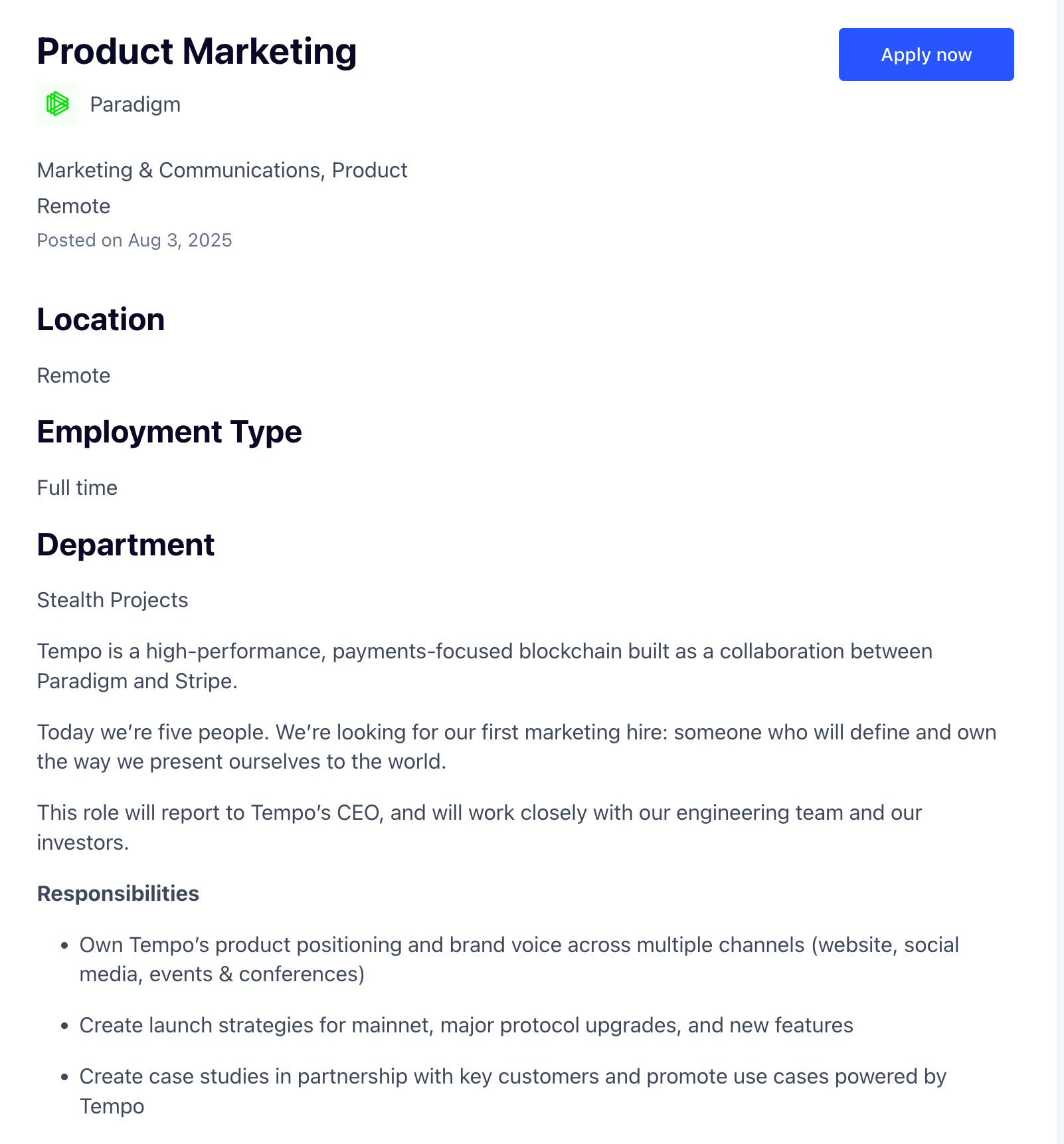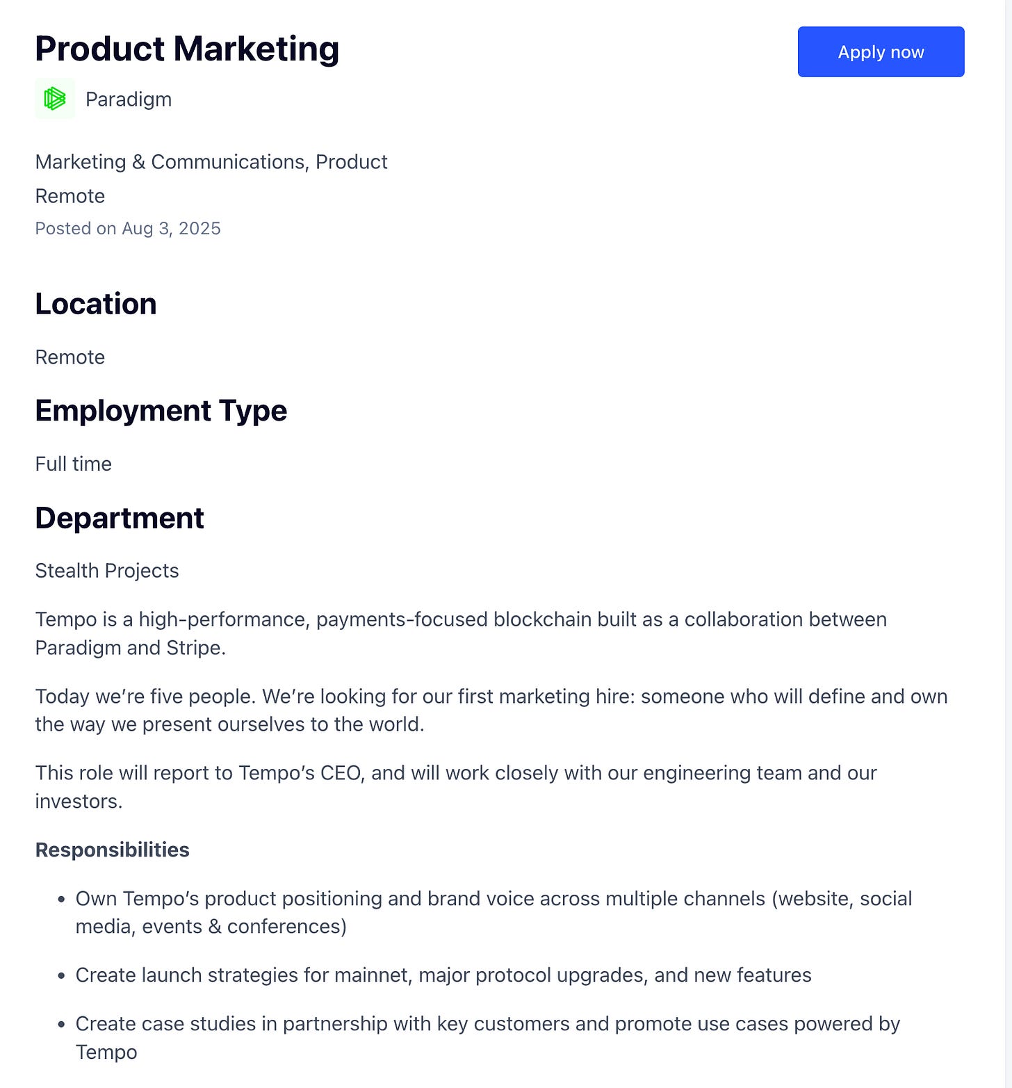 The information about the new TEMPO chain recently leaked from a job offer, now deleted, on the Paradigm website for a Product Marketing Lead.