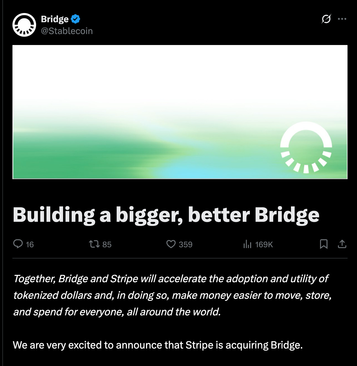Do you remember in October 2024 when Stripe acquired Bridge, a fully integrated stablecoin platform that enabled businesses to easily receive, store, convert, issue, and spend stablecoins? Back then, it was by far the biggest crypto acquisition.