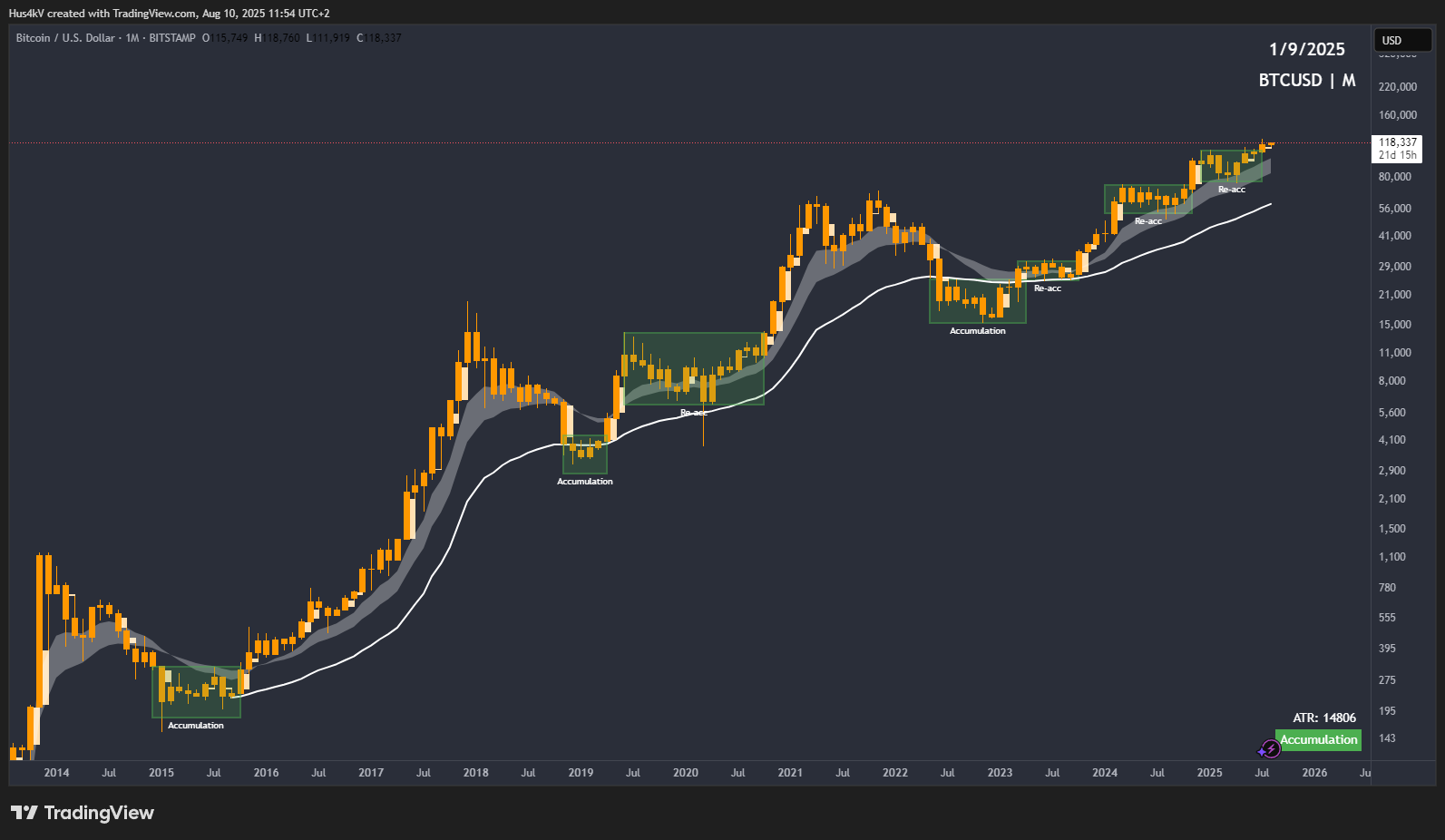 Taking a look at the monthly $BTC chart, we can see a clear uptrend. The EMA 50 has been rising for a long time, and every pullback has resulted in re-accumulation. The expectation is for this type of price action to continue until it doesn't. We’re bullish, fam.