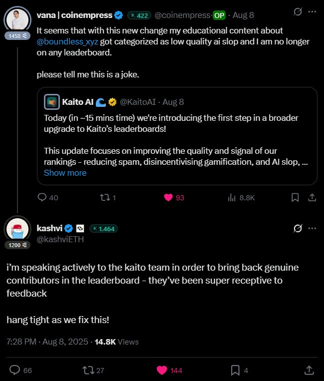 Last week, KaitoAI released a new upgrade to its algorithm to eliminate AI slops and improve the overall quality of engagement needed to climb the leaderboards.