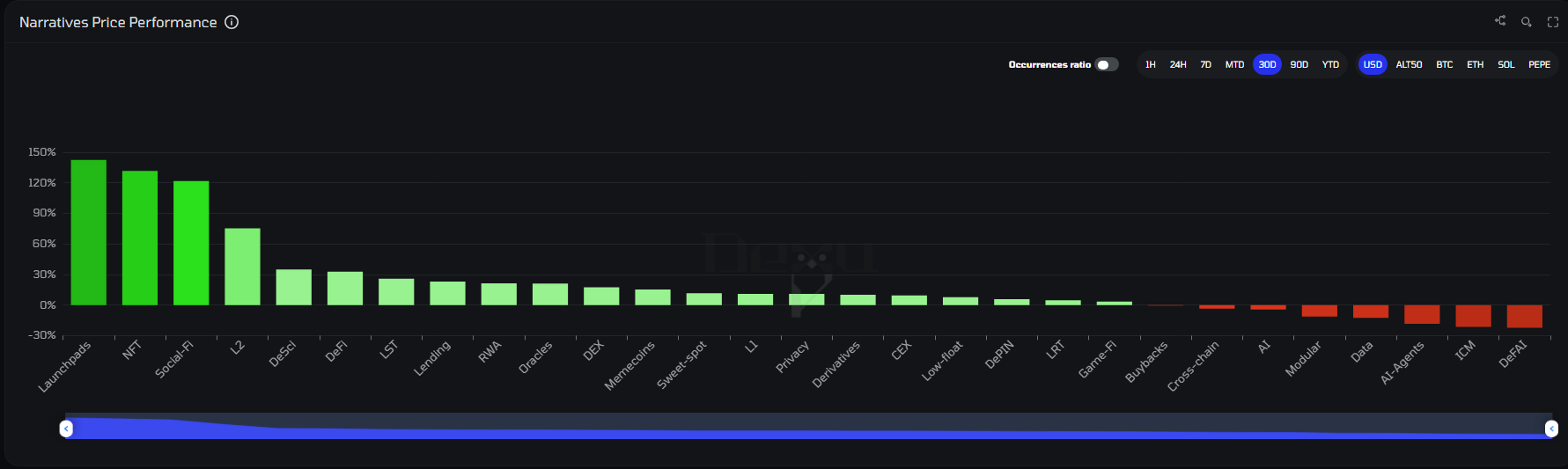 Taking a look at the past 30 days, the strongest narratives have been Launchpads, NFTs, and Social-Fi, all increasing by more than +100%. On the other hand, the weakest-performing narratives have been DeFAI, ICM, and AI Agents, all decreasing by around -20%.