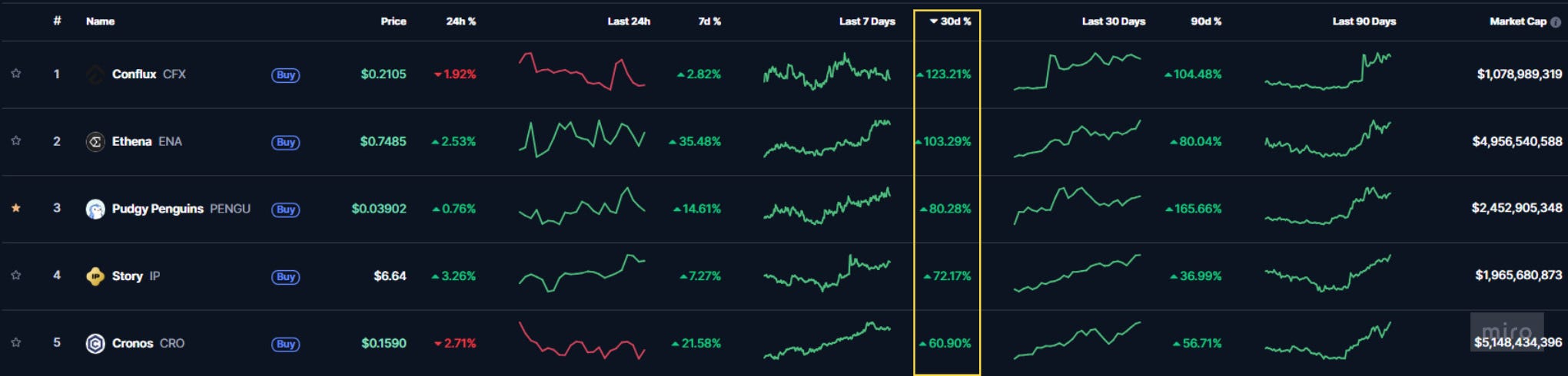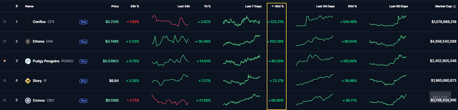 Sorting by 30d%, we can see the biggest winners of the past month. The top 5 have all gained over 50%, with $CFX leading the charge with an impressive 122% increase.