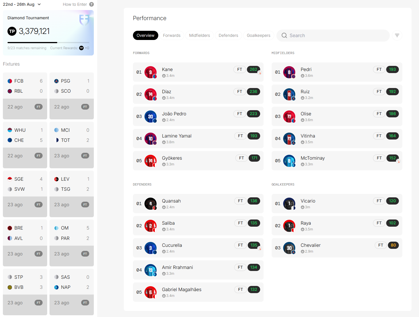 As we all know, during the season, teams compete to win matches and championships. For every match players take part in, users receive a score on FDF based on their performance. Their scores are summed and used each week, from Friday to the following Monday and from Tuesday to Thursday, to calculate the team manager’s (your) score for the weekly tournaments.