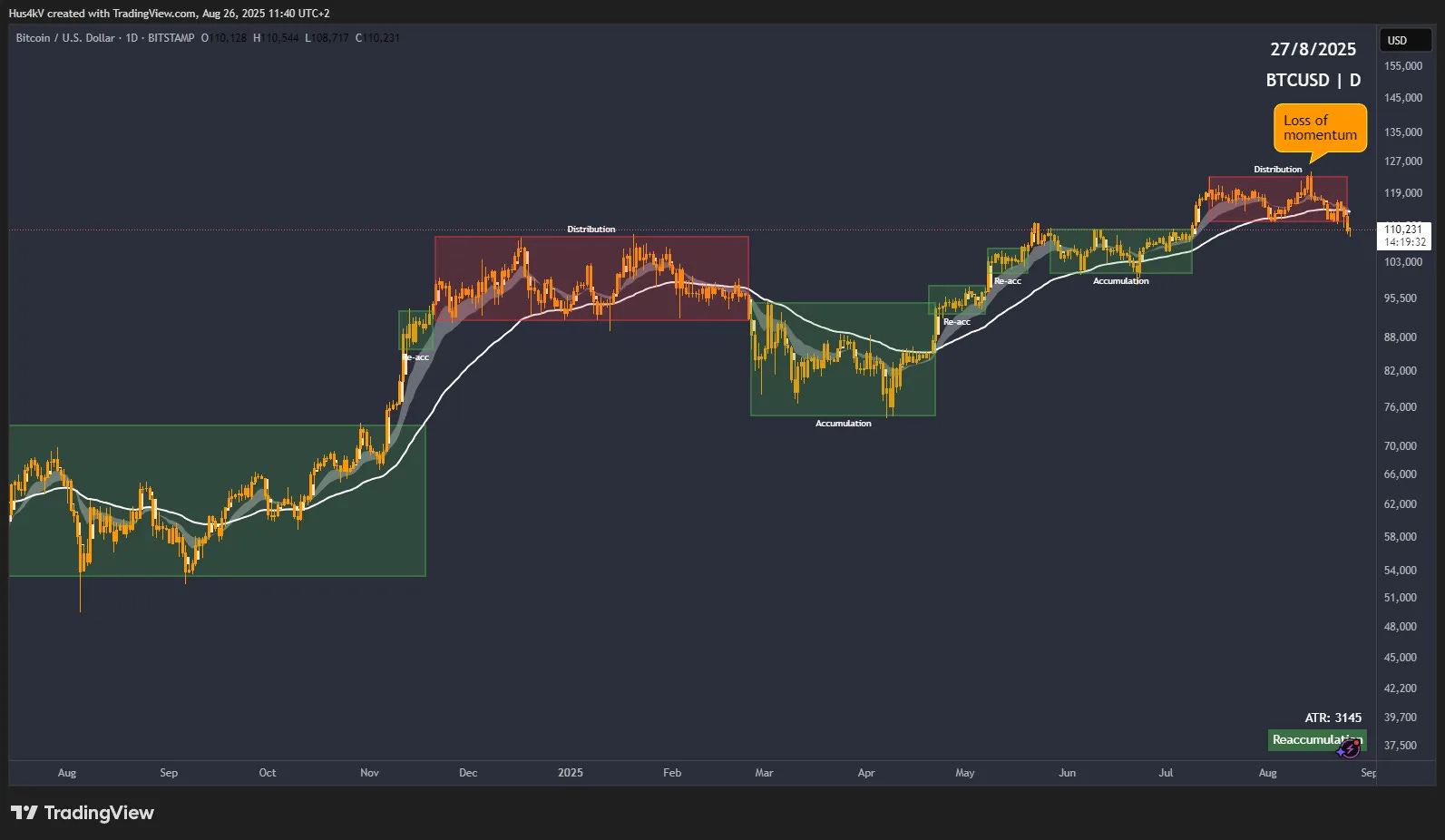 Taking a look at the daily chart, this most recent sideways price action looks like a distribution to me, especially given the liquidity grab of the previous ATH and the subsequent sell-off. The momentum is definitely weakening here, and we might see some short- to medium-term bearishness.