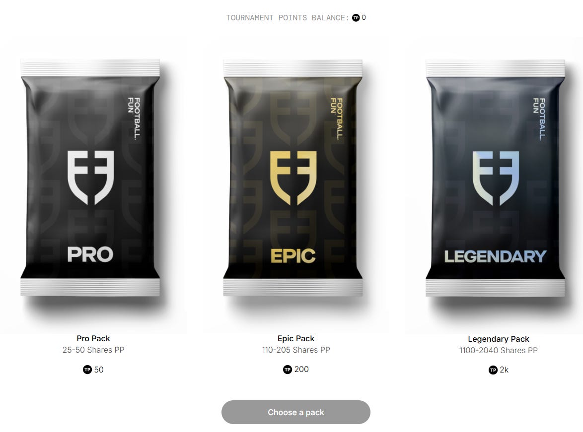 Players can also be found in packs, which could originally be bought directly to fund the platform but now can only be redeemed with tournament points. They are credited to the user once the weekly tournament ends.