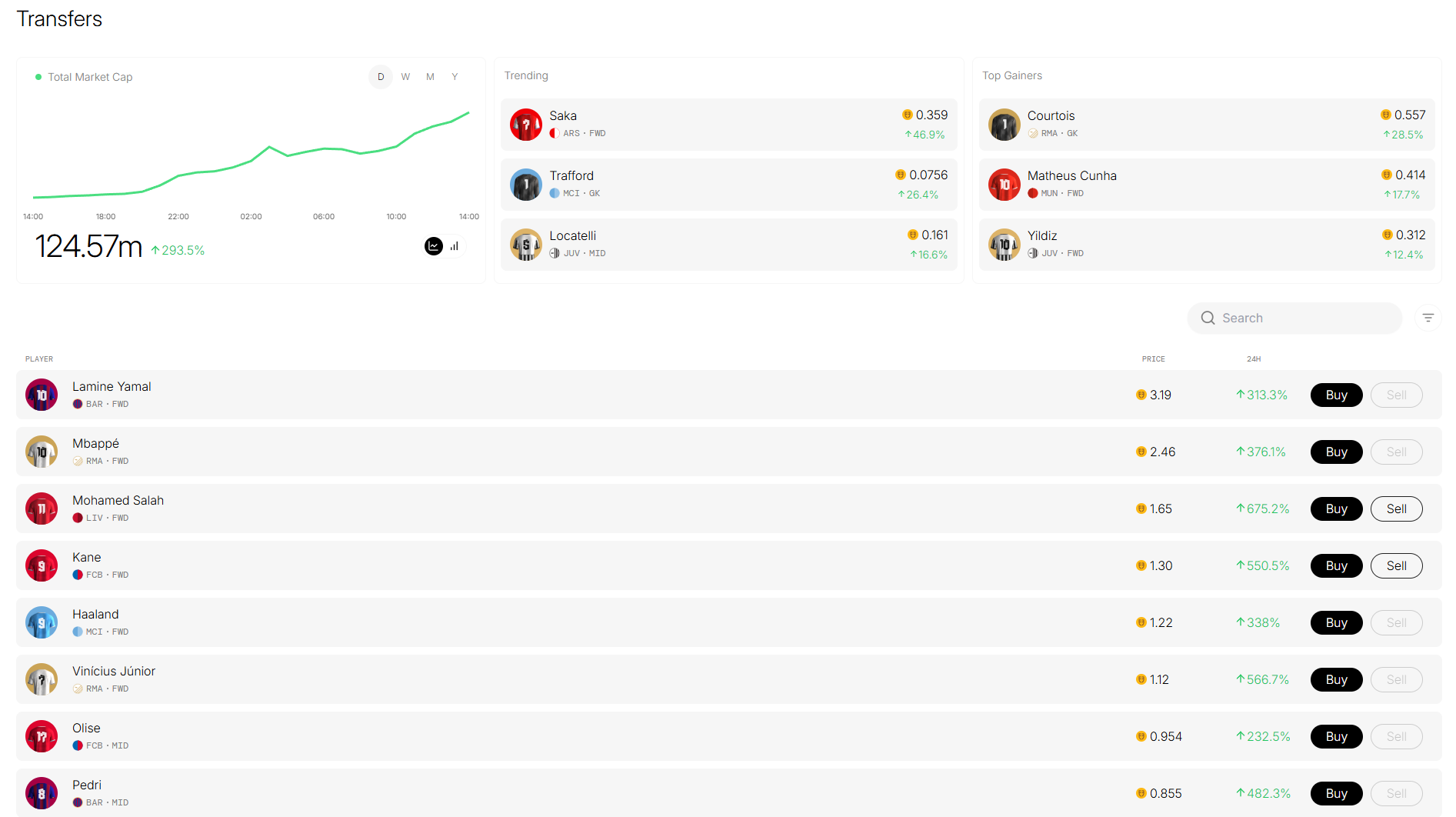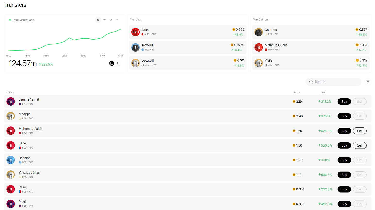 New players are added periodically and start from a “floor price” (e.g., Jude Bellingham still has to be added and will most likely reach a high valuation quickly). This means that entering early could generate serious $. However, with the latest 10-player addition, the site struggled to keep up, and many users couldn’t get their hands on them before it was already too late.