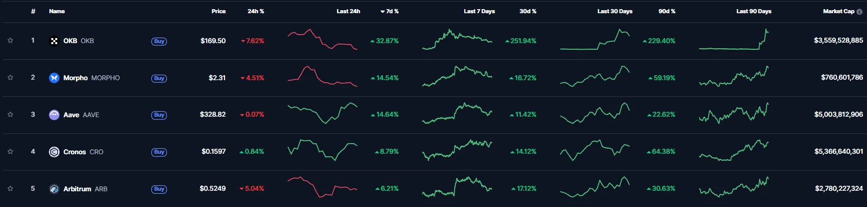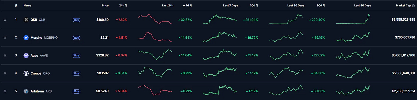 With BTC bleeding out, it’s no surprise to see a calmer week in terms of gains. Most of the TOP 5 are seeing minor gains, except for OKB gaining an impressive +32%.