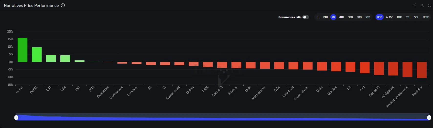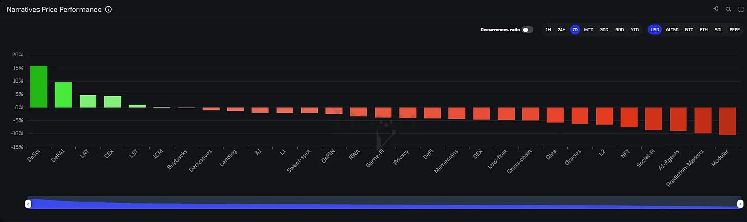 This week, we once again see a relatively balanced narrative profile, with nothing standing out too much. DeSci gained a little over 15%, driven by BIO and CRYO, while Modular lost a little over 10%, mostly due to declines in AVAIL and DYM.
