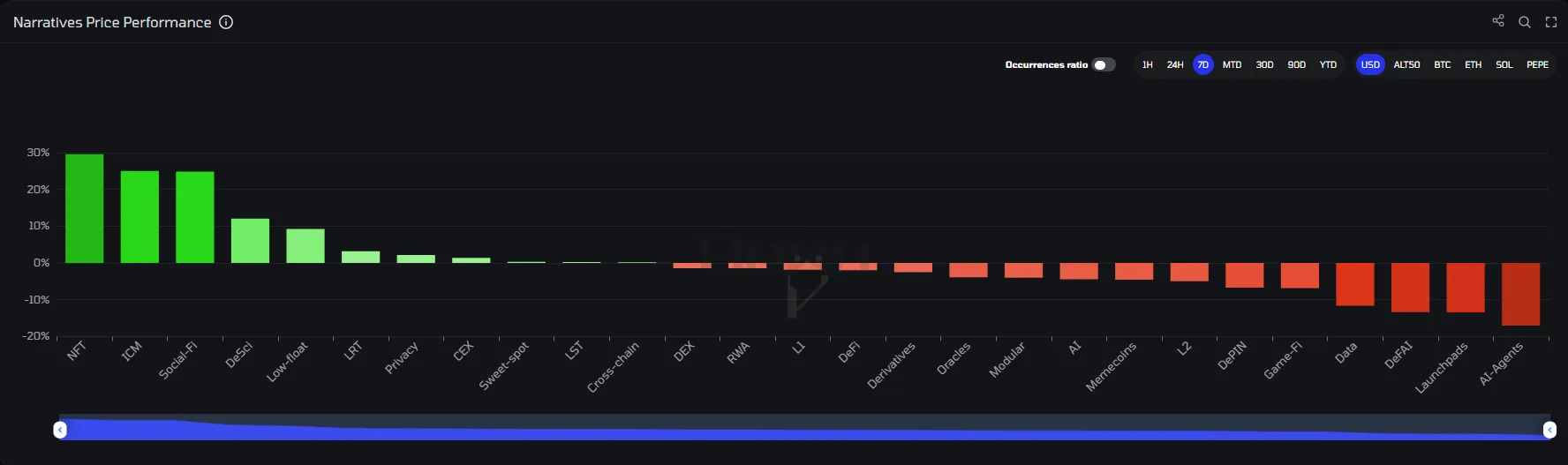 This week has had both winners and losers, with the biggest gainers being NFT, ICM, and Social-Fi, all adding close to +30%. AI Agents, on the other hand, have suffered the biggest losses, being down close to -20%.