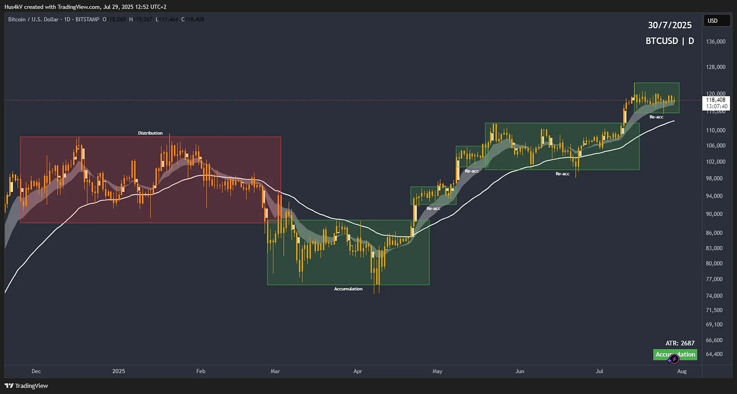 Taking a look at the daily chart, BTC has been going sideways again for a while. I expect this consolidation to once again become a re-accumulation and for price to reach new ATHs.