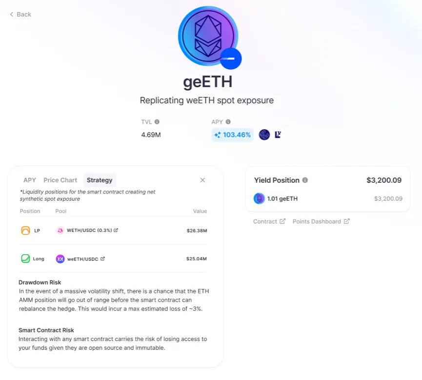 For example, it will provide liquidity in the ±30% range on the ETH/USDC pool in Uniswap V3. This exposure is similar to selling a covered call. It will then open a long position in the GammaSwap ETH/USDC pool to neutralize the IL exposure and create delta-neutral exposure in ETH terms. The gETH token will earn market-leading yields compounded into the position. The token is also composable and can be used in other DeFi protocols to earn additional yield.