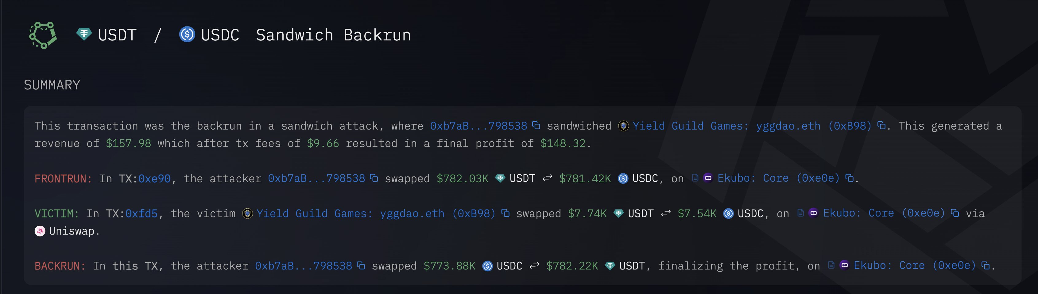 Ethereum’s DeFi is far from efficient: sandwich attacks are still widely exploited by MEV bots to extract value from swaps. An example from a recent swap on Ekubo, one of the most used DEXes on Ethereum, shows a sandwich attack where a user lost almost $200 while swapping $7.74k from USDT to USDC, while the exploiter made around $9k in profit.