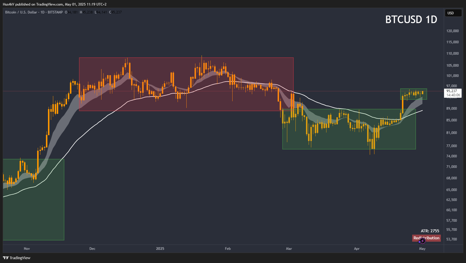 The daily chart tells a clear story. Starting from the initial accumulation (the large green box all the way on the left), we saw a strong breakout that resulted in a picture-perfect momentum cycle. Price continued to rise above all the ascending EMAs, printing re-accumulation after re-accumulation whenever it pulled back. Eventually, it reached its peak and distributed, followed by a multi-month bear market. Now, price is showing immense strength, which leads me to believe that we might see a continuation to new highs.