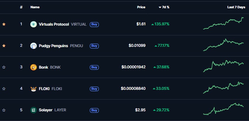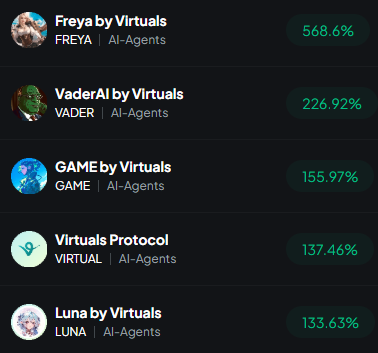 Just take a look at the best-performing coins within the AI Agents narrative: all by Virtuals.