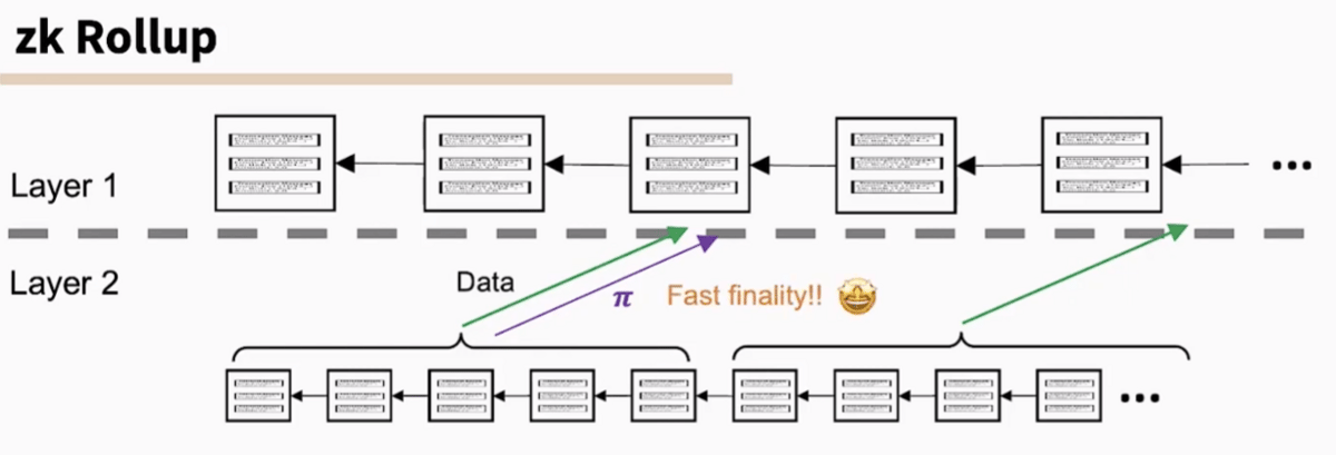 Visual representation of how a zk Rollup (L2) posts their Data in batches with a Proof (π) which can be verified on the L1 quickly for fast finality.