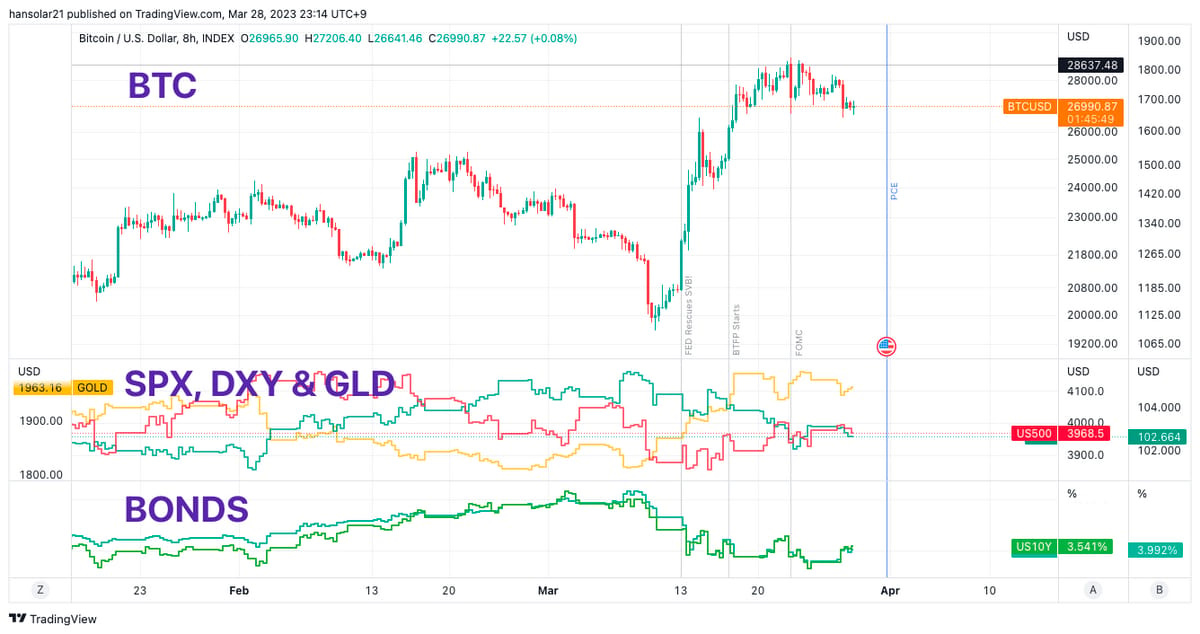 Gold, SPX, and DXY all not showing much movement. US02Y sustains its sizable gap below the current and target interest rates for 2023 indicating the bond market believes that there will be interest rate cuts this year.