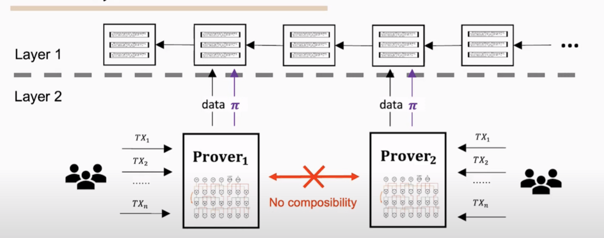 Provers that prove different types of transactions (from different dApps) do not have composability out of the box. For example, one proves DEX transactions, while the other proves transactions on money markets. These can have two totally different proving systems which might not be composable with each other. This is where a zkEVM comes in. A zkEVM has one big general prover system which can handle more general functions for proving, but what if I told you that they do this quite neatly?