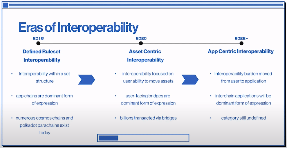 All topics of the picture above are happening simultaneously and are more set to be modes of interoperability than specific eras with end dates. The basis was defined in 2016 when Polkadot and Cosmos made different rulesets of scaling block size. After that, around 2020, interoperability was mostly focused on bridging specific assets between ecosystems. Everything was wrapped everywhere, all at once via different types of bridges. Nowadays, we are slowly starting to become more app-centric. Not where the assets as isolated data can be bridged, but where whole dApps can freely interact between blockchains. And what happens here is that the burden of interoperability is moved from the user to the dApp, creating less friction and easier access.