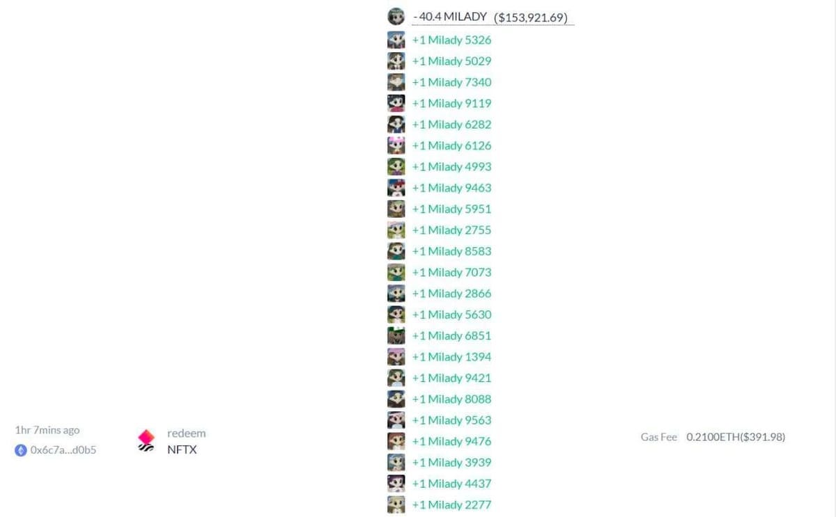 GCR redeemed all of his Milady NFTs from NFTX protocol, and holds 265 Miladys in total.