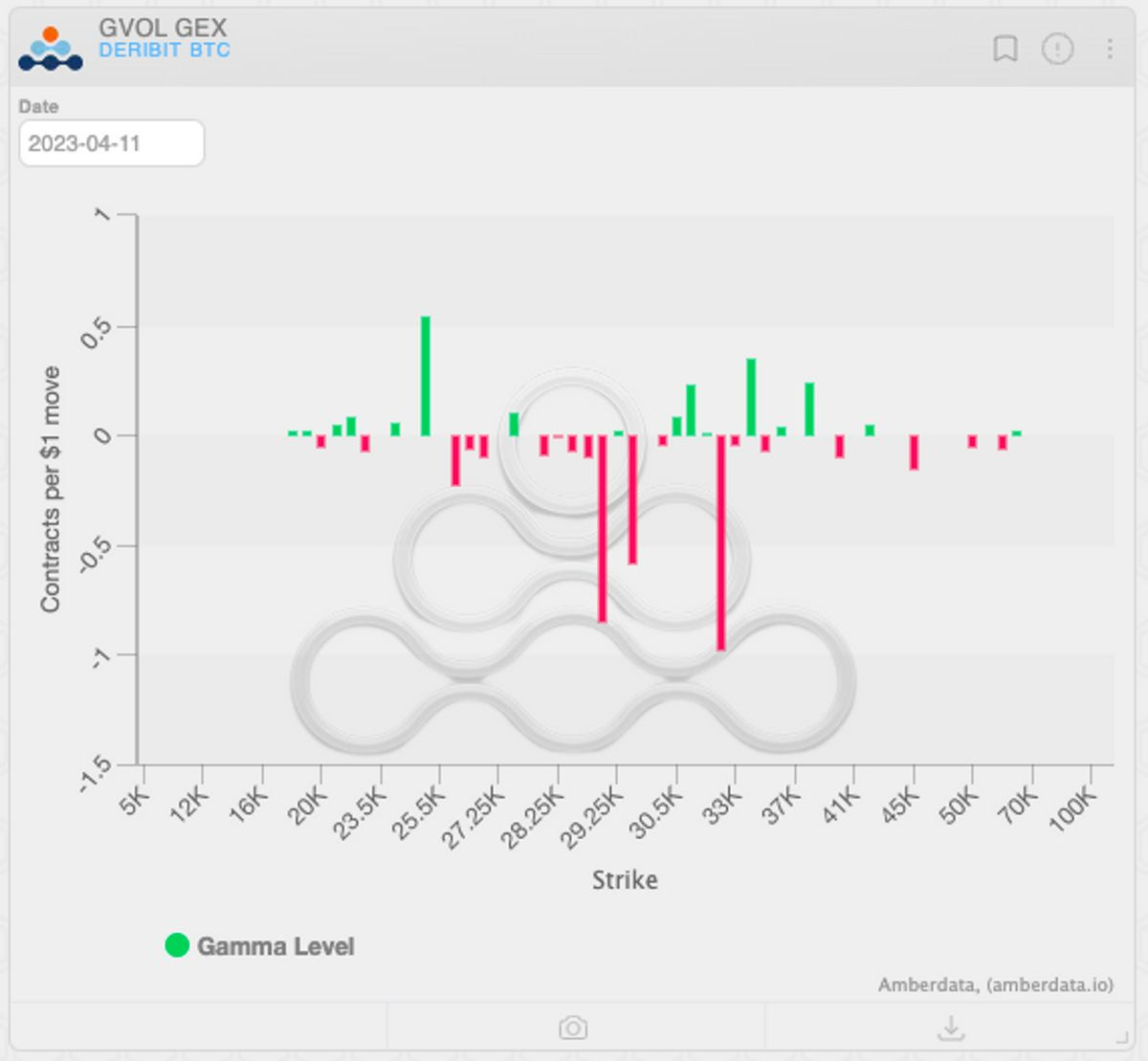 Mixed gamma plot for BTC. Negative gamma below 30k could indicate a quick slide if we start trending downward.
