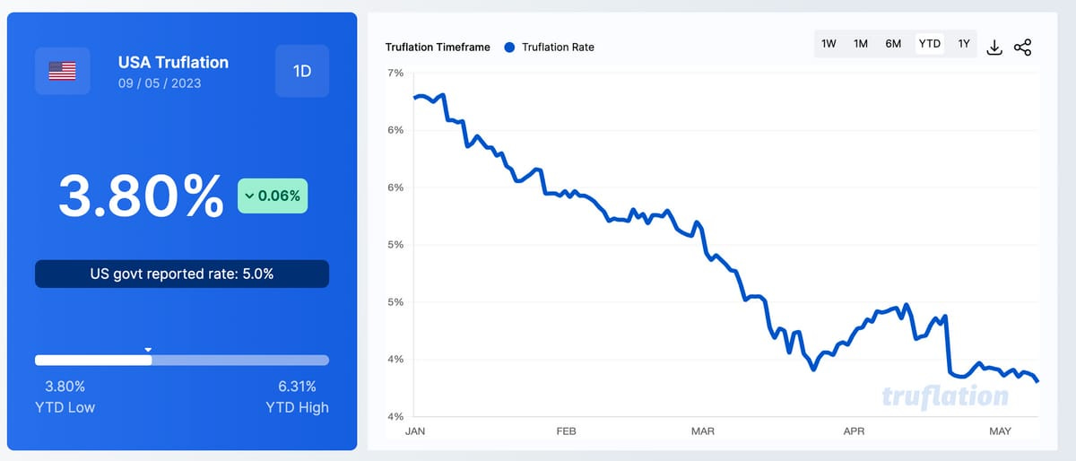 Truflation(real-time inflation monitoring service) points to lower inflation numbers around 4.5% for April and the PPI, a forward indicator of inflation, last month came in substantially lower which could also filter down to a lower print for this month. However, the job market has continued to show strength. Nonfarm payrolls on the 5th overshot forecasts by 40%! This could cancel out some of the disinflationary trends.