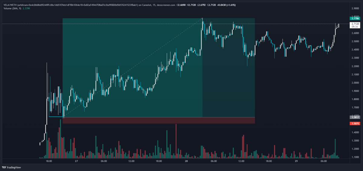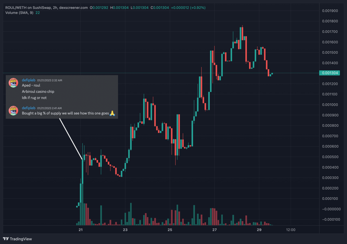 A wallet that was scalping $TND very well started consecutive $2k buys with a $100k loaded wallet. They amassed $20k worth of $TND before the community caught on, assuming they would use the entire $100k. After the community pump (+20%) over 20 minutes they then exited the entire position ($24k for a $4k profit).