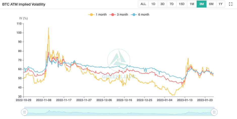 BTC ATM Implied Volatility for 1m, 3m and 6m expiries
