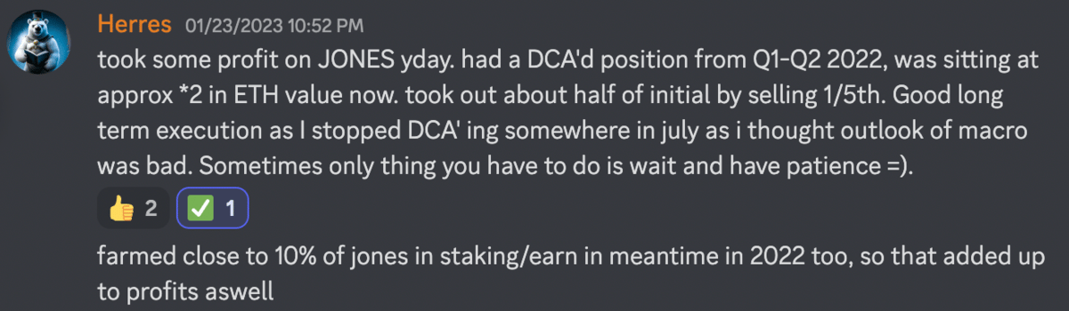 Herres Takes Profit on Long-term $JONES DCA Bag