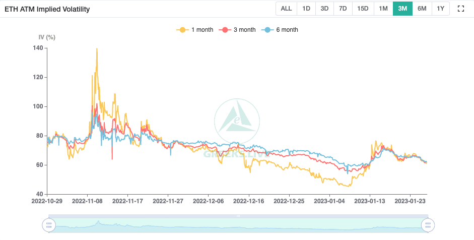 ETH ATM Implied volatility for 1m, 3m and 6m expiries