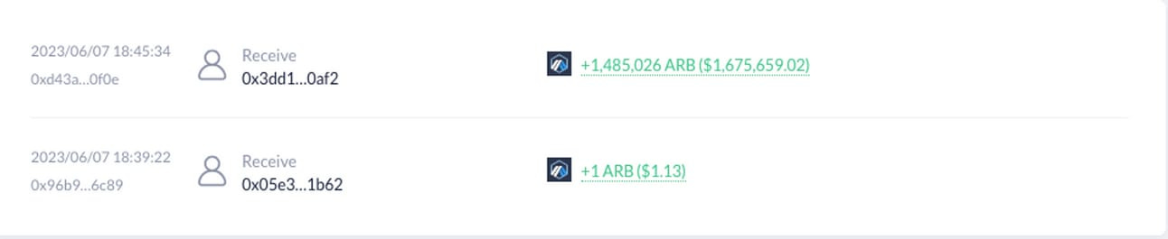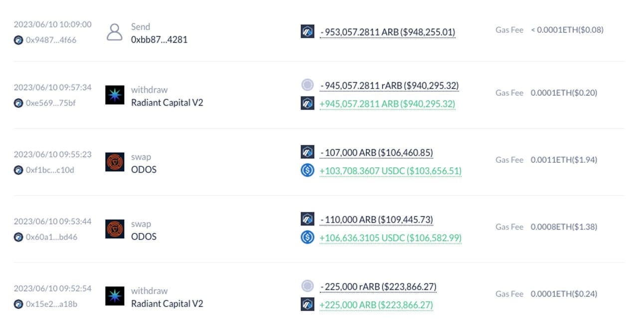 The $ARB transaction on DeBank (which also links to that wallet)