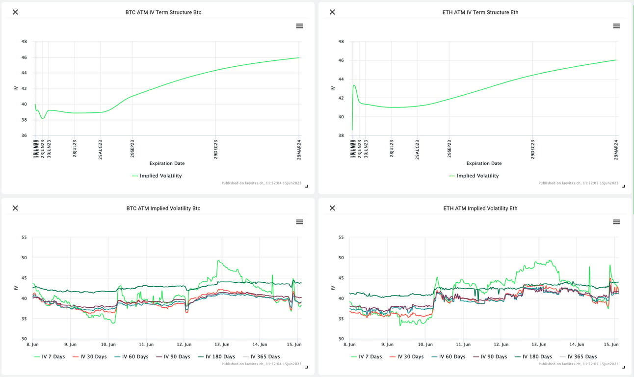 There was a temporary spike in the IV for BTC and ETH around the FOMC meeting, which quickly dissipated back to more of the same suppressed IV environment.
