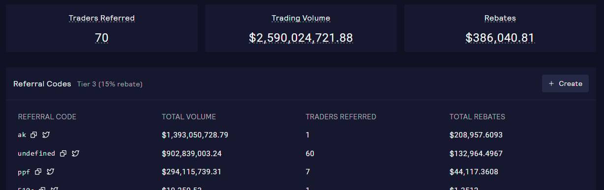We can dive a bit deeper by logging onto GMX using impersonator.xyz and the 0xe7..e10a address to see which referral codes the account has registered. Various codes pop up, among others ‘ak’ (hmm, someone’s initials perhaps?) that has a combined volume of $1.4bln.