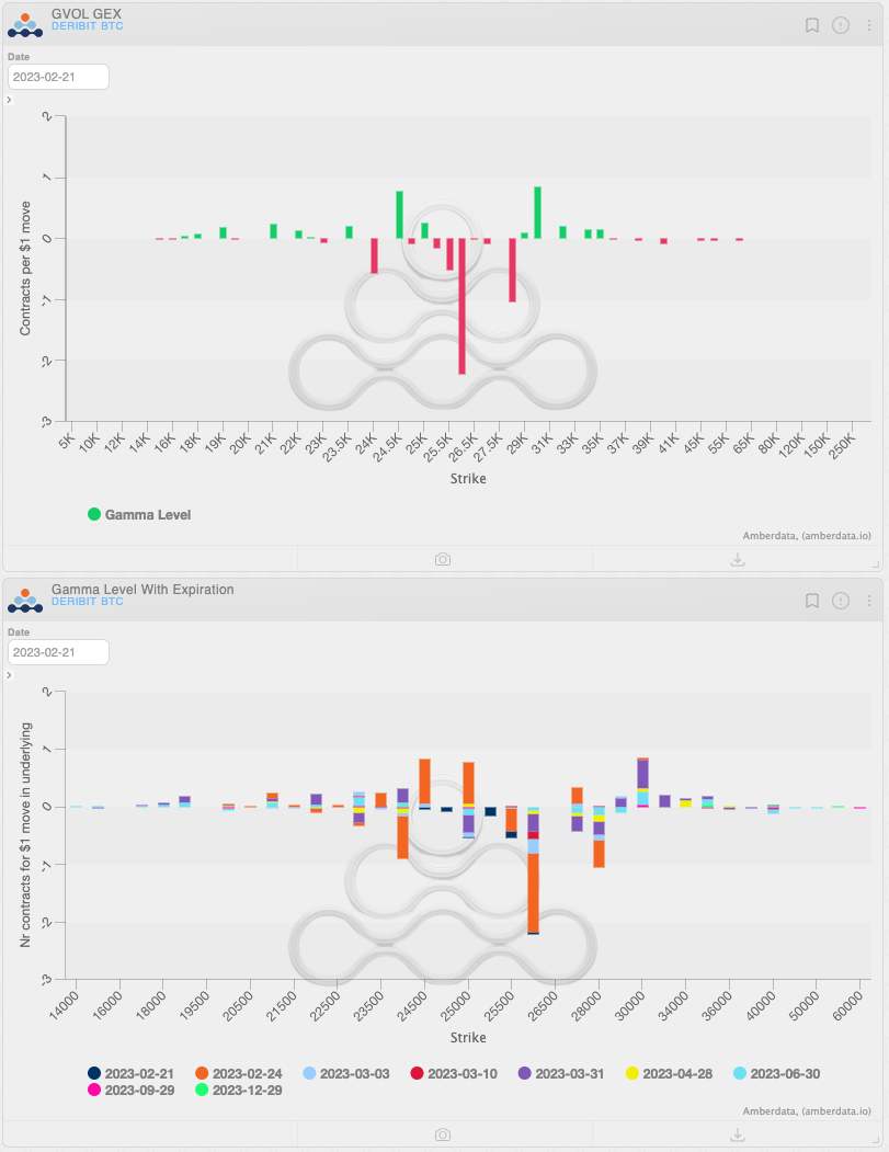 Reading Amberdata’s gamma charts : Positive pillars repel price, negative bars attract price. Currently, 24,500 acting as support 30,000 resistance and 25.25k to 28k acting may act like price attractors. The bottom chart shows the positions with expiries. A large negative gamma position for the 26000 strike expires this Friday, so there’s a time aspect as well to consider.