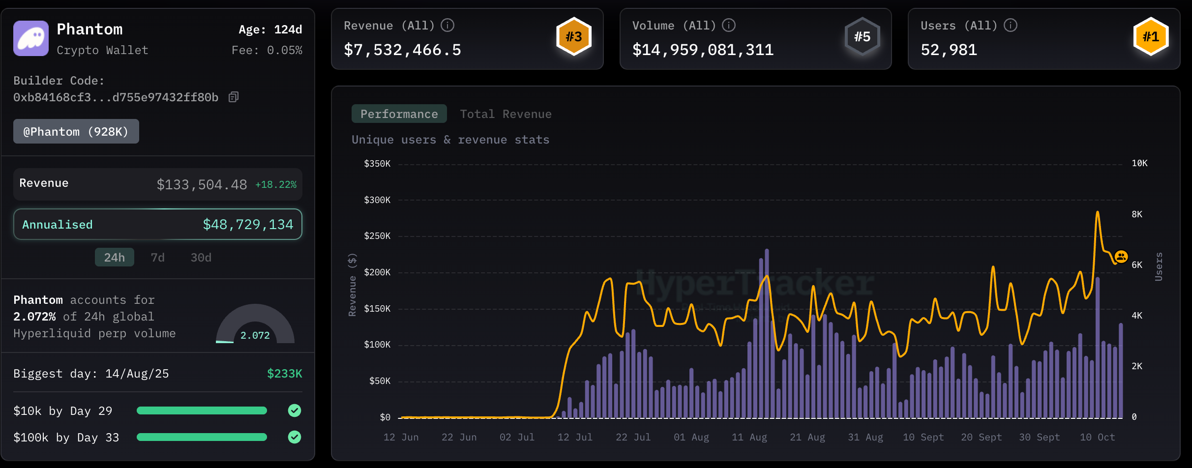 Since then, Phantom wallet made more than 7,5 million USD in fees with a total of 52,981 users leveraging the direct connection between the wallet and the HL orderbook.