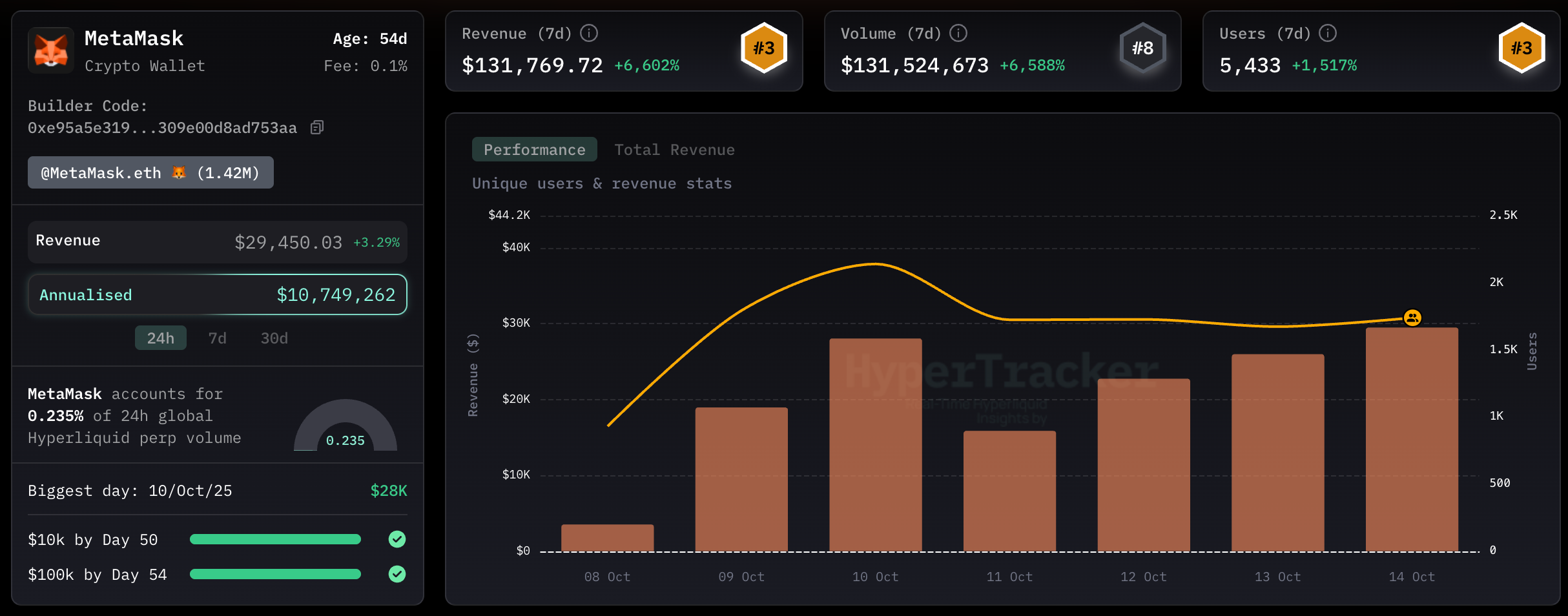 Launched on October 8, so less than 1 week ago, they seem to have been able to leverage their existing user base well. 5433 Metamask users have done 131 million USD volume routed to HL orderbook via buildercode & MM was able to bank 131k USD on this volume.