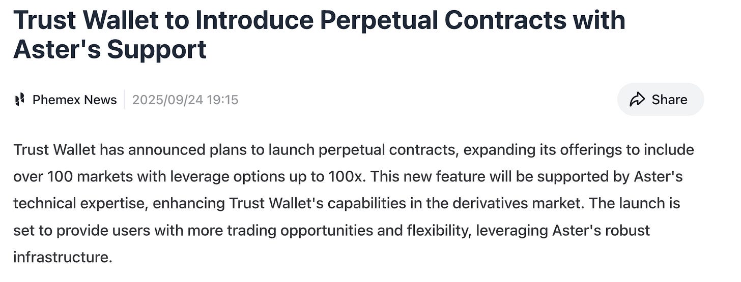 Anyway, in conclusion, I think that more and more wallet provider will look to integrate perpetuals directly into their application giving the possibility to their users to degen trade with leverage safely without going anywhere outside of their frontend. The next being Trust Wallet (CZ wallet provider) looking to integrate Aster directly into their frontend. And we could even see Rainbow wallet looking to integrate HL orderbook into its frontend.